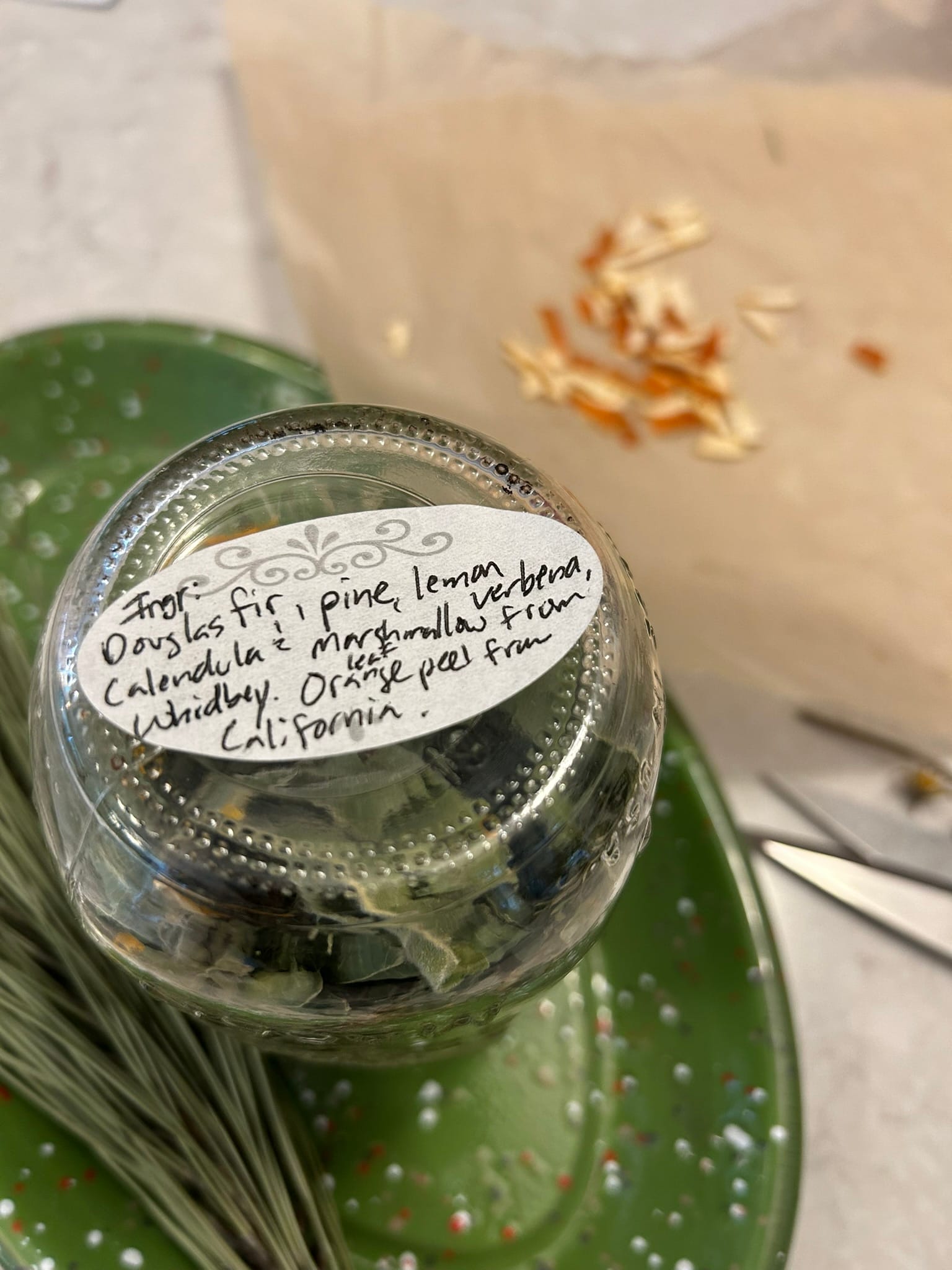 - plus a few pinches of: Dried orange peel and Calendula flower petals (chosen here for their collective beauty medicine, ability to create movement in the circulatory and lymph systems, remove stagnation from the body and gently/steadily invigorate mind and body, re-connect you to needed sunshine, and soothe digestive inflammation– I also chose the orange peel because my friend is originally from a sunny place and struggles with our much grayer Pacific Northwest winters). Two notes. Note 1: don't take calendula internally if you're pregnant unless cleared by your herbalist or other trusted heathcare guides and professionals, and if you're allergic to ragweed then you may want to pass on calendula flowers too, but a few are usually fine for most). Note 2: I chose this combination of plants for a specific friend. If you are friends with other plants and you want to change something to make sure you and your friend(s) will enjoy it even more, you can choose other plants. However, if you're not good friends with a plant– good enough to know its history with humanity or at least its history with you and the friend you're making it for–go carefully. Plants are powerful beings. Some interfere with medications, cause allergic or intense reactions, etc. We're here to mend our broken hearts and celebrate friendship together, not put anyone in the hospital. ;-) - When they're mixed together, figure about one tablespoon of tea mixture per cup or mug. A little more if you're using chopped fresh plants. If you want to figure out the weight of the amounts of tea per cup/mug that you like best, you do you. My dad would. But that's not me. Each time, I/who I'm with co-create what I/we believe each friendship and unique person and moment needs or would like. If you're using dried plants and making a jar as a gift or for later use, keep the plant parts in as large a form as possible in the jar (whole leaves, whole tips, whole or halved needles), and then crush the plants together just before you make the tea. Some (like lemon verbena) will crush well. Many of these other plants don't. Just do your best and focus on the friendship and creativity parts, not the striving-for-perfection part. This is not that kind of tea. This tea and ceremony support relaxation (especially relaxing worrying, spinning minds), collective creativity, trusting yourself and others more, and deepening relationships with friends, plants, and the planet we live on.