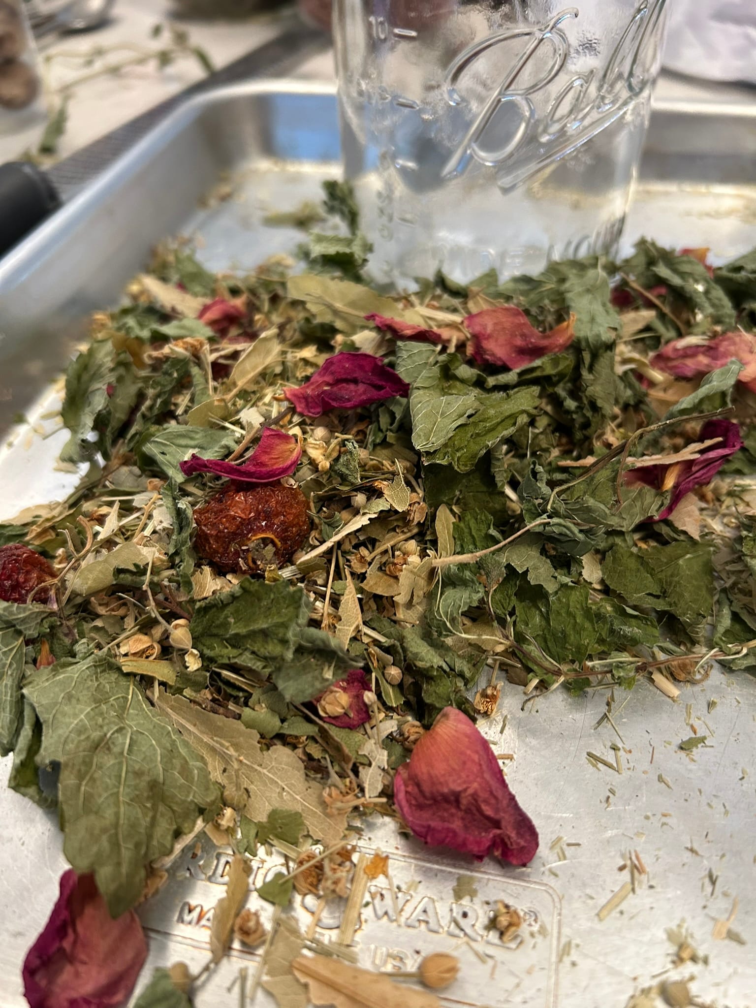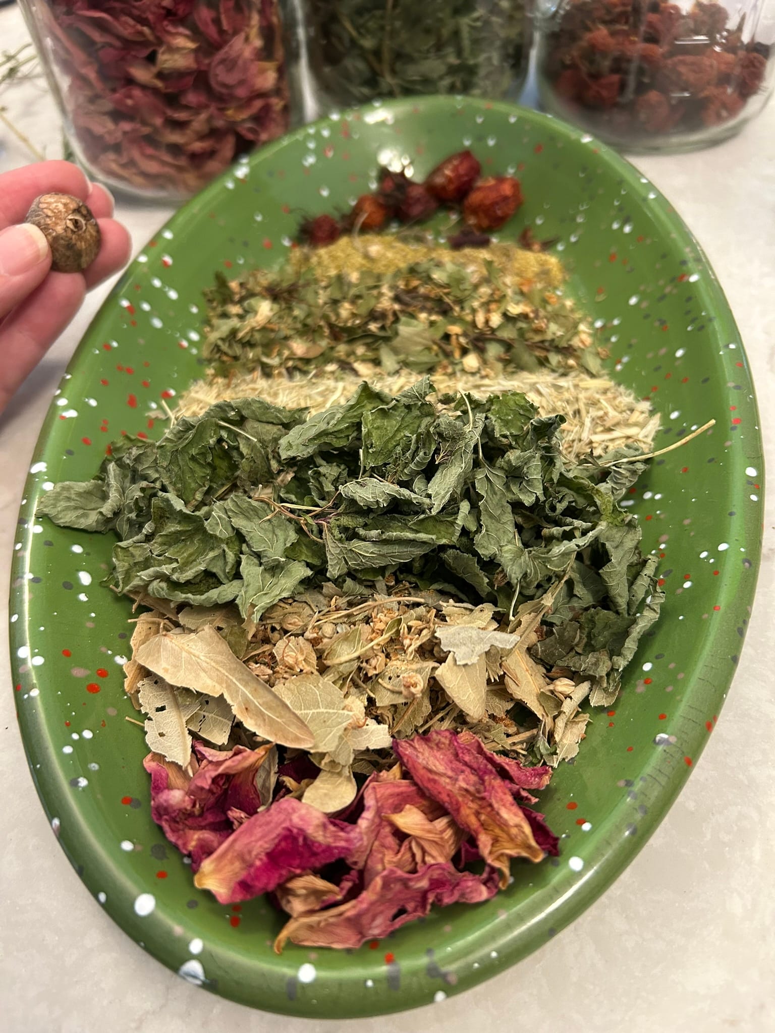 - With a friend or for a friend, intuitively gather and mix together roughly equal parts dried or fresh: