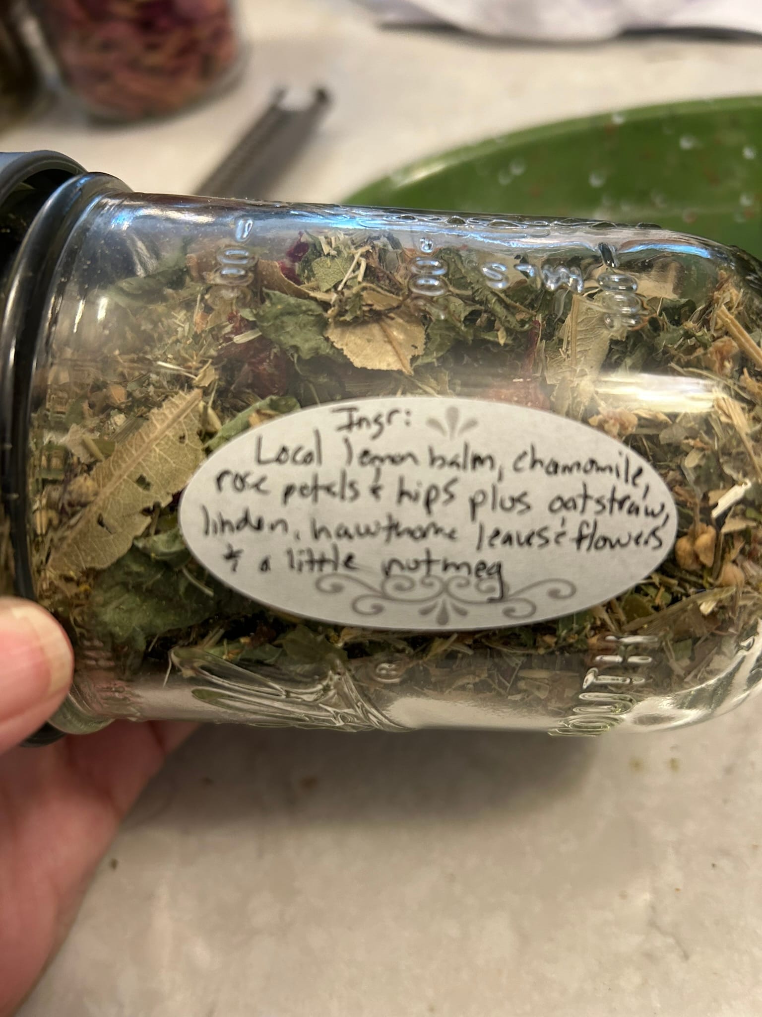 - Plus just a small dash/sprinkle of dried nutmeg. (chosen here for its warming, relaxing, mood lightening, sleep-promoting, and tasty nature– just don't do too much! Just one a small dash/sprinkle from the jar or one scrape down the microplaner if you have whole nutmeg. In my experience, more is definitely not better.) - When they're mixed together, figure about one tablespoon of tea mixture per cup. A little more if you're using chopped fresh plants. If you want to figure out the weight of the amounts of tea per cup that you like best, you do you. That's not me. If you're using all dried plants and making a jar as a gift or for later use, keep the plant parts in as large a form as possible in the jar (whole leaves, whole flowers, etc.), and then crush the plants together just before you make the tea. Except for the nutmeg, which you should add just a small dash of at the end. Some (like lemon balm, chamomile, linden, and hawthorne leaf) usually crush well when dry. Some of the plants/parts don't. Just do your best and focus on the friendship and creativity parts, not the striving-for-perfection part. This is not that kind of tea. This tea and ceremony support relaxation, rest, collective creativity with friends and ancestors, and deepening relationships with friends, plants, and the planet we live on.